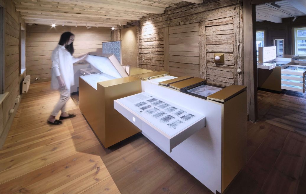 Jelgavos senamiesčio namo ekspozicija įrengta istoriniame bute. Namo istorija pateikiama trijose didelėse aukso skryniose. Atidarę skrynių stalčius lankytojai gali sužinoti faktų apie Jelgavos medinę architektūrą, Jelgavos senamiesčio namą, jo istoriją ir atnaujinimą. Ekspozicijoje naudojami inovatyvūs ir interaktyvūs sprendimai – vaizdo įrašai, animuotos nuotraukos, audiogidai (latvių, anglų ir rusų kalbomis). Specialiai ekspozicijai sukurtų garso kūrinių ir kasdienių garsų pagalba lankytojai gali pajusti senųjų laikų namo atmosferą ir tapti ekspozicijos šurmulio dalimi.